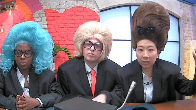 'Big Bros LTD' is the corporation they are working for this week. The big wigs in charge are: Yinrun, Trish & Henry. Middles (in Office wear) Kerry, Paul, Matty & Zak. And Jordan in office wear but an Orange 'fire warden' bib. Jordan also has a white helmet with a red light on & a megaphone! Then the bottoms (Orange polo shirts & yellow safety bibs) are: Jenkin, Dylan, Chanelle, Noky, Farida, Olivia, Tom & Hallie. The big wigs n middles got to keep their duvets, but the bottoms only had thin grey blankets! The bigwigs can talk to the middles, but not the bottoms. Lots of people changed around beds to make it easier to remember who can talk to whom. The bigwigs are in the mezzanine room, which has been turned into an office. there was a plane on the desk & it's underside had some numbers on, including '1 9 8 4' they then talked about the book 1984, though only Henry knew who the author was & Yinrun (bless her) at one point asked what the actual name of the book was!!), Pretty sure none of them has ever read it. (dear readers, go read it or audio book, it is awesome!) Also Yinrun spent 10 minutes in front of the mirror fixing her bigwig under her chin, as it was getting really messy looking & Matty helped her!!! |