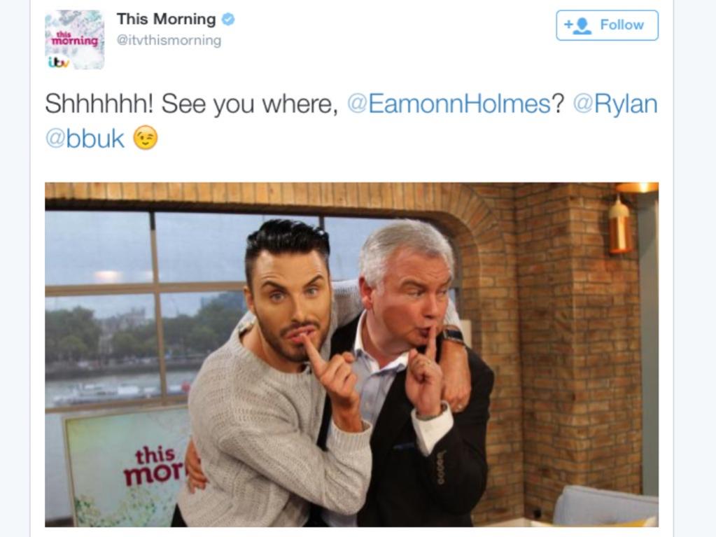 Rylan was with another woman and Ruth and Eamonn and they were talking about one direction splitting up, and towards the end of the interview thing, eamonn said 'thankyou rylan, I'll see you in the house' and Ryan went 'oh god you've blown your cover'