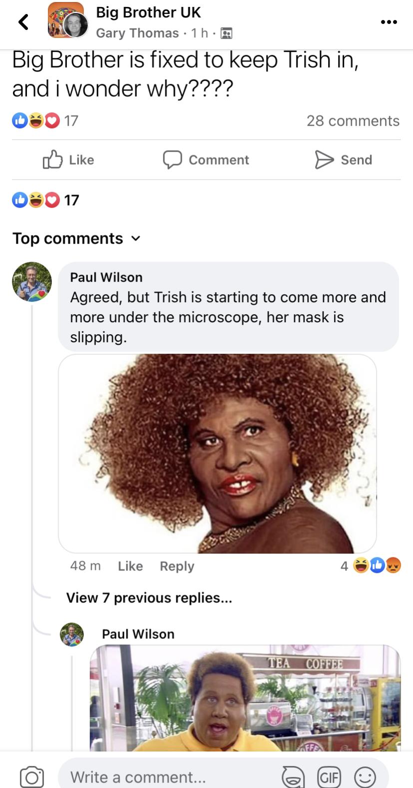I mean there was a lot of racist factors involved. Not every vote that went Trish’s way was from a racial point but you only need to have one quick look on the Facebook pages to see the racial abuse. People haven’t made it up to try and validate it. Yes people have their reasons to evict her. Too intelligent or too overbearing or whatever but to me she had a heart of gold and I’ll defend her to the hills