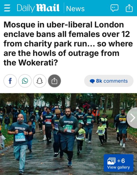 A charity run organised by the East London Mosque Trust has excluded women and girls aged 13 and over from taking part. The Muslim Charity Run, which was held in Victoria Park in Tower Hamlets on Sunday, said on its website: "Our inclusive atmosphere ensures that every individual, from the youngest to the oldest, can take part and make a difference." It added: "This is open to men, boys of all ages and girls under 12, but everyone is welcome at the park to cheer on the runners." The organisers have been contacted by BBC London for comment. The 3.1-mile (5km) event, previously known as Run 4 Your Mosque, was the 12th race to be held by organisers. It faced criticism on social media, where people questioned why women were not allowed to take part in the race, given the focus on inclusivity. https://www.bbc.com/news/articles/c1kwk1204jno The Mayor of Tower Hamlets sees no issue The mayor of Tower Hamlets has defended a mosque’s decision to ban women and girls under the age of 12 from taking part in a charity fun run. East London Mosque has been accused of breaching the Equality Act, after it imposed the restrictions on the event held in Victoria Park on Sunday. The website claimed the event was “family friendly” and inclusive”, open to men, boys of all ages and girls under the age of 12, adding “everyone is welcome at the park to cheer on the runners”. Prizes were presented by Tower Hamlets mayor, Lutfur Rahman, who referred to the event as a “truly inspiring community effort”. “It was a pleasure to attend the prize-giving ceremony at the 12th Muslim Charity Run in Victoria Park, London, organised by the East London Mosque,” he wrote. https://www.msn.com/en-gb/politics/g...d=BingNewsSerp This is London folks