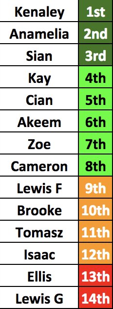 2) Anamelia 3) Ellis 4) Zoe 5) Kenaley 6) Cian 7) Brooke 8) Lewis F 9) Kay 10) Akeem 11) Sian 12) Cameron 13) Isaac 14) Lewis G