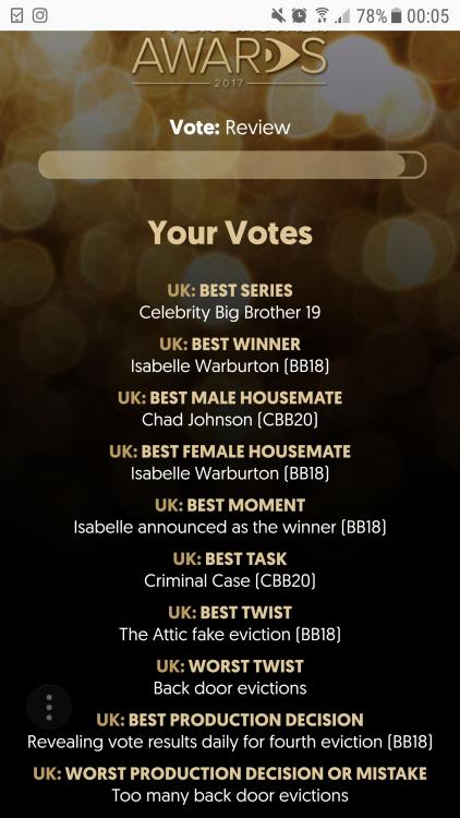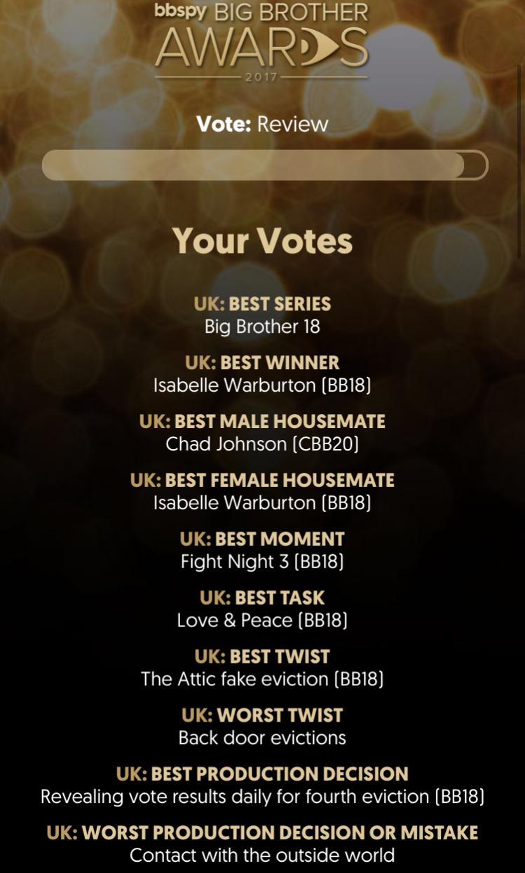 Best Series: Celebrity Big Brother 19 Best Winner: Isabelle Warburton (BB18) Best Male Housemate: Jedward (CBB19) Best Female Housemate: Kim Woodburn (CBB19) Best Moment: Kim Woodburn's 'Adulterer' meltdown (CBB19) Best Task: Superheroes & Sidekicks (CBB19) Best Twist: All Stars and New Stars (CBB19) Worst Twist: Back door evictions Best Production Decision: Sending Chloe, Jessica and Kim in as latecomers (CBB19) Worst Production Decision or Mistake: Too many nominations twists International Best Season: Big Brother 5 Canada Best Twist: Returning houseguests (BBCAN5) Best Male Houseguest: Cody Nickson (BB19 USA) Best Female Houseguest: Ika Wong (BBCAN5) Best Alliance: Jody (BB19 USA) Best Moment: Neda evicted immediately after losing immunity (BBCAN5) Best Competition or Task: Slop Vote 2017 (BBCAN5) Best Gameplay: Ika orchestrating Neda's eviction (BBCAN5) Worst Gameplay: Houseguests playing Paul's game instead of their own (BB19 USA) |