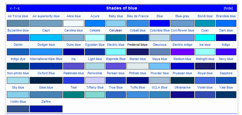 More info here - https://en.wikipedia.org/wiki/Shades_of_blue I like a shade similar to Egyptian Blue. |