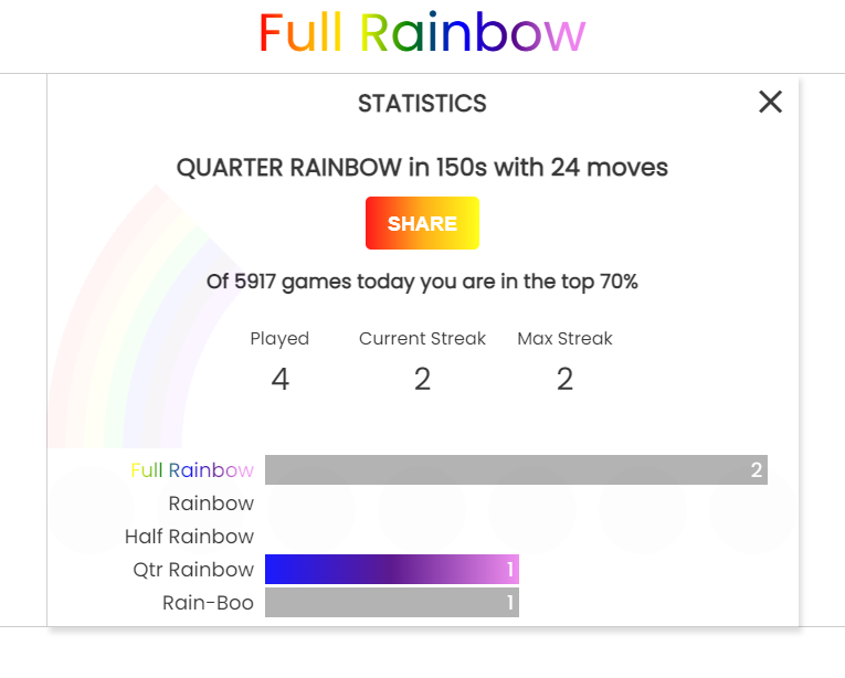 QUARTER RAINBOW in 150s with 24 moves. “More is lost by indecision than wrong decision.” —Marcus Tullius Cicero