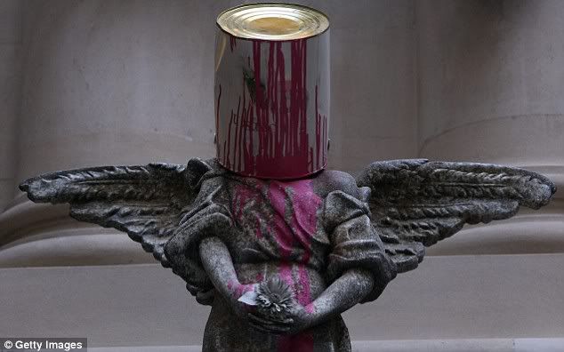 An original Damien Hirst painting has a giant stencil of a rat painted over it and part of Banksy's 'Bog Henge' - made from portable toilets at the Glastonbury Festival - also appears.