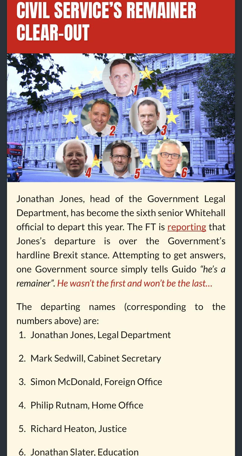The legal guy left because the government is trying to break the law. His views on remain/leave are irrelevant at this stage because we've left. In fact, purging any remainers doesn't make any sense. Brexit has been won, and tories have a massive majority. 5 remainers have no power to do anything. If an African or middle east government were doing this, you'd see how dangerous removing anyone who thinks differently is.