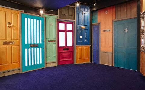 That red door to the left of the front doors, definitely leads to something. It's at the right height(the bottom touches the floor) and it is set back further than the other doors. Diary Room perhaps, secret room even.