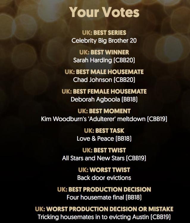 Big Brother 18 UK: Best Winner Isabelle Warburton (BB18) UK: Best Male Housemate Jedward (CBB19) UK: Best Female Housemate Isabelle Warburton (BB18) UK: Best Moment Fight Night 3 (BB18) UK: Best Task Superheroes & Sidekicks (CBB19) UK: Best Twist All Stars and New Stars (CBB19) UK: Worst Twist Back door evictions UK: Best Production Decision Sending Chloe, Jessica and Kim in as latecomers (CBB19) UK: Worst Production Decision or Mistake Lack of live feed |