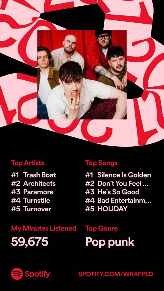 For me it was: Minutes listened: 19,517 Top genre: Contemporary country Top five artists: 1. Morgan Wallen 2. Eric Church 3. Luke Combs 4. Lady A 5. Morgan Wade Top five songs: 1. Wilder Days - Morgan Wade 2. Things a Man Outa Know - Lainey Wilson 3. If It Wasn't For Trucks - Riley Green 4. Half of My Hometown - Kelsea Ballerini 5. Beers to Catch Up On - Locash Unsurprisingly country dominated lol, strangely only one of my top five artists features in my top five songs |