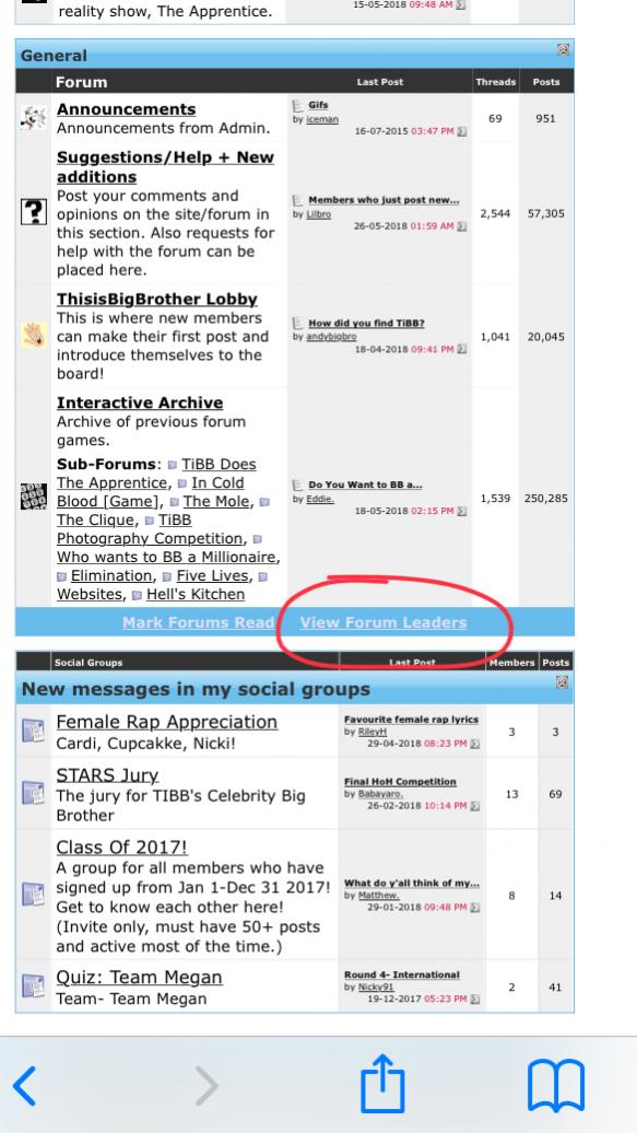 Scroll down to nearly the bottom of the TiBB home page and click “View Forum Leaders.” You’ll see it above your group chats I’ve attatched a photo of what I see on mobile for you   | |||