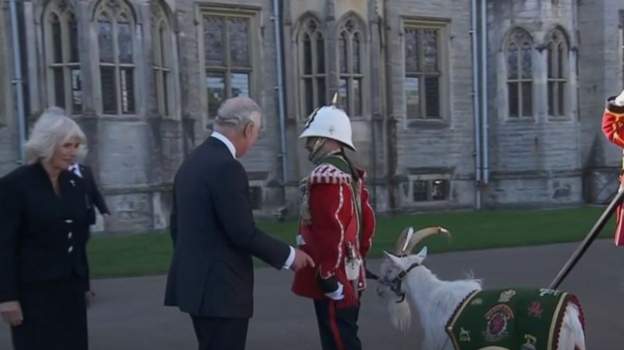 ![]() As King Charles and Camilla, the Queen Consort, left Cardiff Castle to meet military officials and the public, there was one very noticeable four-legged attendee. Lance Corporal Shenkin IV - a goat - is a very popular member of the Third Battalion of The Royal Welsh. Sheinkin IV, the Battalion's official goat, is the latest in a long line of regimental mascots for the Royal Welsh. He's also got his own Twitter account. At one point, Charles could be seen pointing and laughing at the furry military mascot before Camilla lent down to acknowledge him. |
