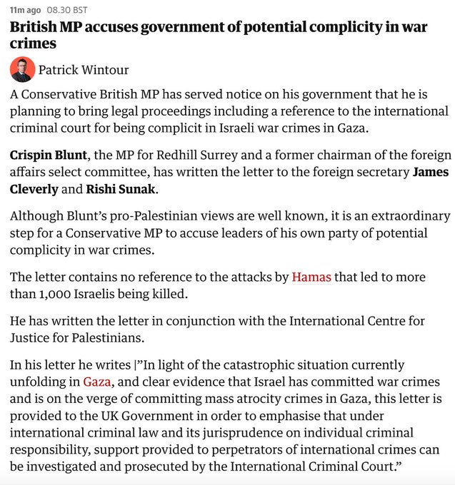 Maybe it's unwarranted optimism (optimism is not a particularly strong point of mine) but I can sort of sense the tide may be turning. Andrew Neil and Piers Morgan furiously backtracking on their inflammatory rubbish from a few days ago. Politicians being threatened with international courts for breaking international law. Suddenly people seem to be moving away from "Israel can do whatever it likes," and the actual reality of what Israel has been doing to the Palestinian people is becoming more widely known. They say sunlight is the best disinfectant, but it's just a shame that there might not be any Palestinians left.