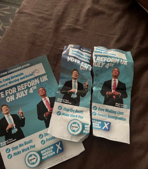 "A Royal Mail postman has been caught writing 'racists' on Reform UK leaflets " video of him doing it is here: https://x.com/Nigel_Farage/status/1805588125751681097 |