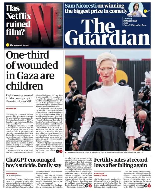 [Children under 15 years old made up almost a third of patients treated for injuries in Gaza field hospitals run by Médecins Sans Frontičres last year, the Guardian reports. Figures released in correspondence with medical journal the Lancet reveal wounds from bombs, shelling or shooting were involved in half of the more than 90,000 patients treated in 2024.]