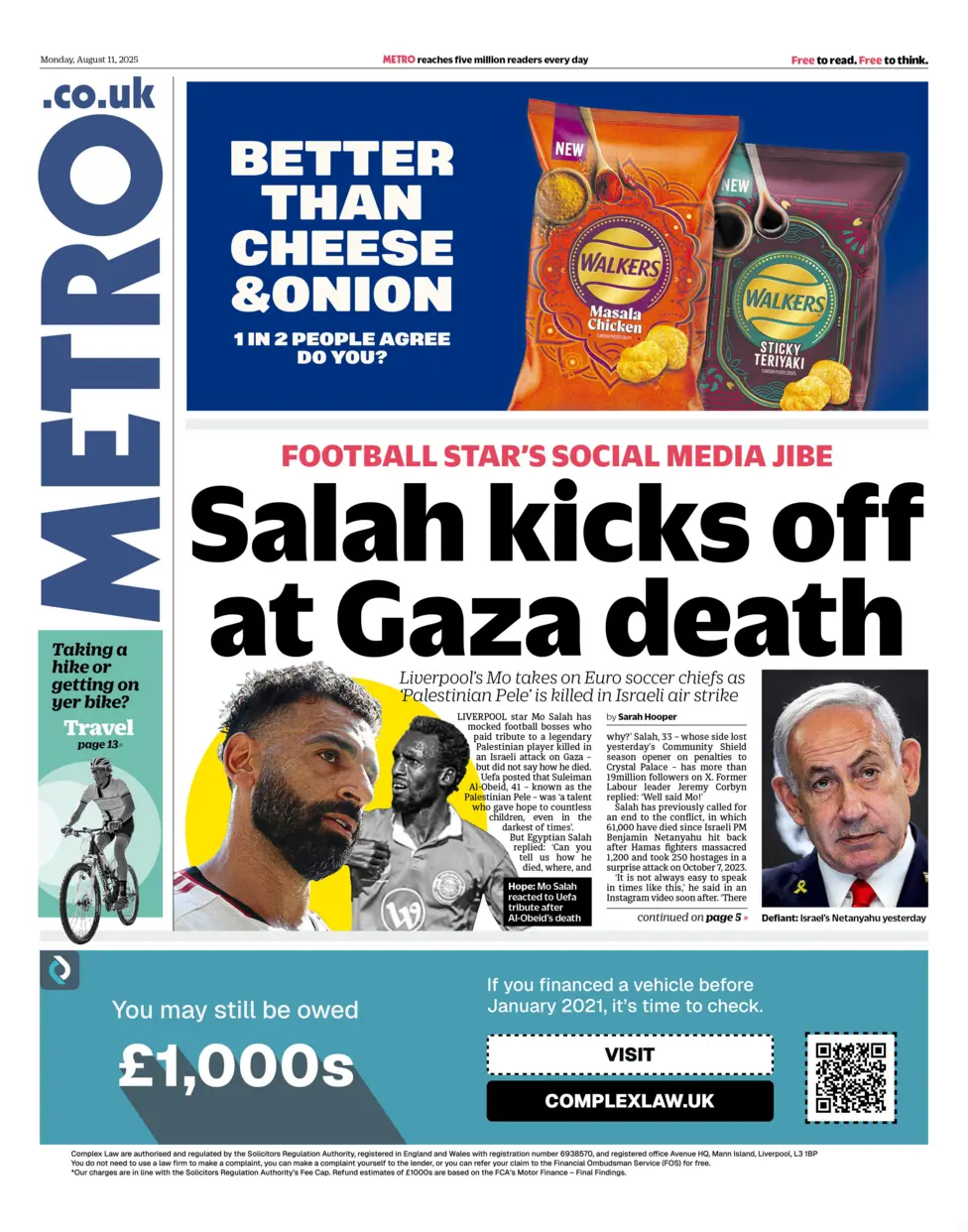 [The Metro leads with Liverpool star Mohamed Salah's jibe at football bosses who paid tribute to a Palestinian player killed in an Israeli air strike in Gaza. The paper says Uefa's post remembering Suleiman al-Obeid did not say how he died, which prompted Salah to ask: "Can you tell us how he died, where, and why?"]