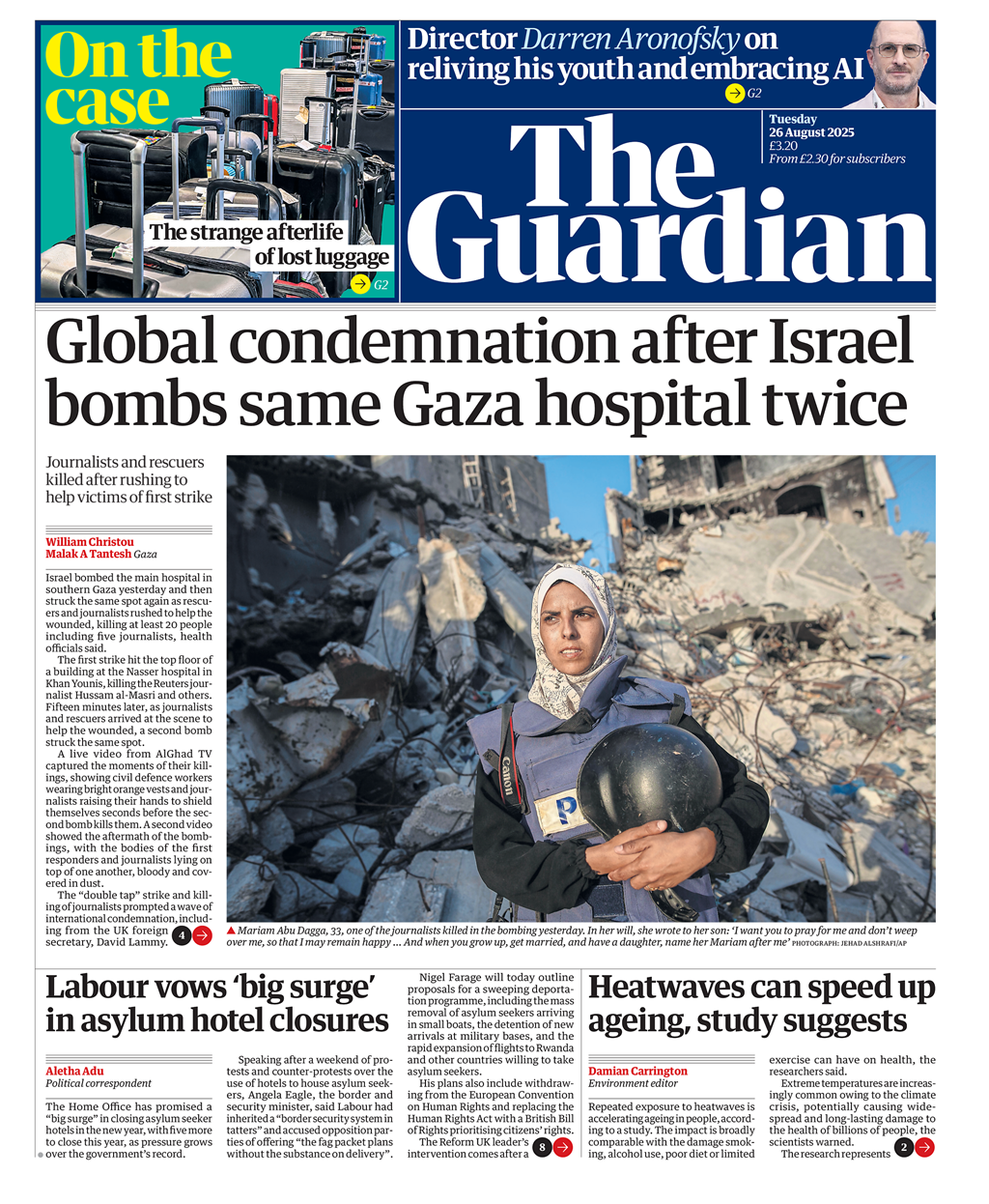 it is now reported that 5 Journalists are among the 20 killed by the IDF Two missiles hit the hospital Also sadly killed Muath Abu Taha of NBC Al-Masri of Reuters Maryam Abu Daqqa of The Independent and AP Last edited by arista; 25-08-2025 at 01:41 PM. |