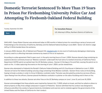 Casey Robert Goonan ("they/them"), who has a Ph.D. in black studies, pleaded guilty to using homemade explosive devices in June 2024 to destroy a @UCPD_Cal police vehicle on campus and to attempt to firebomb the Ronald V. Dellums Federal Building and U.S. Courthouse in Oakland. He also admitted to carrying out three arson attacks on the UC Berkeley campus. Goonan admitted he was inspired by the Hamas direct action terror attacks of Oct. 7 and that he hoped his violence would inspire others to carry out further attacks "for Palestine." Antifa and far-left militants are calling him a "political prisoner" and are demanding his immediate release. The mainstream media reporting is not writing about his anarcho-communist violent extremism and is making it sound like he merely did vandalism on a car. https://x.com/MrAndyNgo/status/1970690436760002643 |