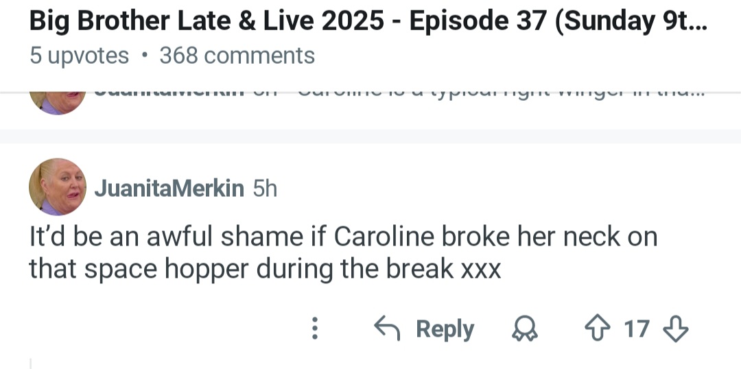 Why do I love her? Because she says what she thinks, she doesn't give a fvvk, she's always down to have fun, she has this tough b1tchy exterior while having a good heart underneath.... and she literally creates all the drama in the house. All the people saying she's "bullied" Richard are ridiculous, he's given as good as he's got and they've both had good humor about it. People take things so seriously these days. She's just having a laugh winding people up. George was my favorite housemate at the start. Then he got booted, for stupid reasons. I thought the series was over. Caroline saved it for me. Last edited by Masterchief117; 07-11-2025 at 03:28 AM. |