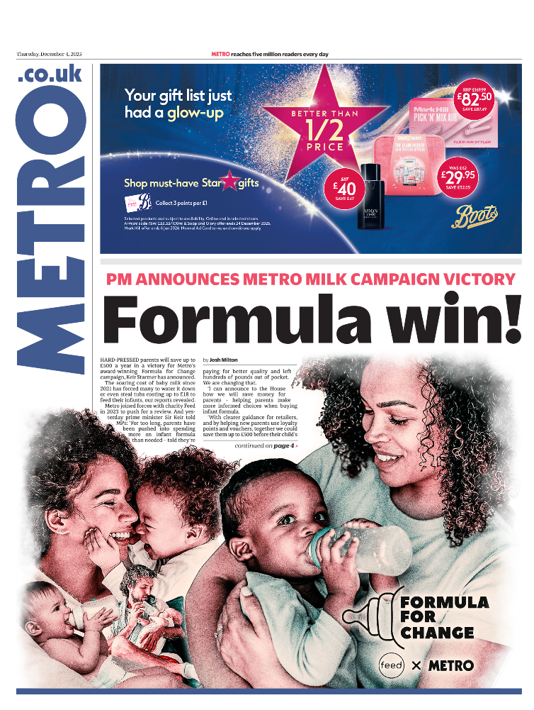 [Starmer has announced that baby formula will be made more affordable, in a win for Metro’s award-winning Formula for Change campaign, the newspaper reports.]