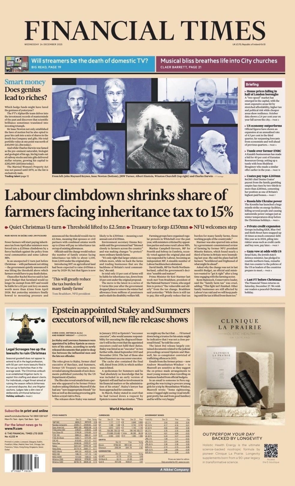[The Financial Times leads with fewer farmers having to pay inheritance tax after ministers were forced into a £130m climbdown on the controversial policy.]
