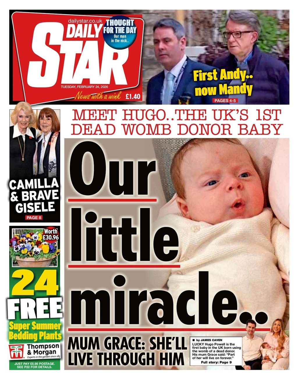 ![]() A baby boy has become the first child in the UK to be born using a womb transplanted from a dead donor. Grace Bell, who is in her 30s and was born without a viable womb, says her little boy Hugo, who is now 10 weeks old, is "simply a miracle". Bell and her partner Steve Powell, from Kent, paid tribute to the "kindness and selflessness" of the donor and her family for their "incredible gift", while also thanking medical teams in Oxford and London who supported their journey. The surgeons involved said the birth was "a ground-breaking moment", which could give hope to many more women with a similar diagnosis. Hugo was born just before Christmas 2025, weighing nearly 7lbs, at Queen Charlotte's and Chelsea Hospital in west London. Bell is one of around 5,000 women in the UK affected by a condition called MRKH syndrome, which means she was born without a womb and doesn't have periods but does have normal ovaries. At the age of 16, she was told she wouldn't be able to carry her own child. To have a baby, the couple's only option was to hope for a womb transplant or go down the route of surrogacy. When she received a phone call saying a womb had been donated and a transplant was possible, Bell remembers being "in complete shock" and "really excited". But she was also acutely aware of the donor family's "incredible gift", which would enable her to carry and give birth to her own child. "I think of my donor and her family every day and pray they find some peace in knowing their daughter gave me the biggest gift: the gift of life," Bell said. "A part of her will live on forever." https://www.bbc.co.uk/news/articles/cvg53xp5857o |