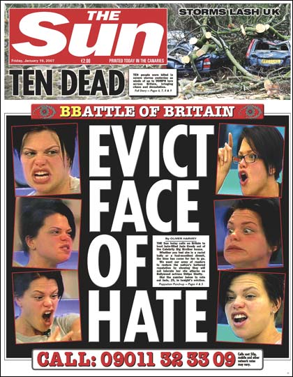 And I would just like to add... Jade Goody was not racist! To be racist you have to intend to be, Jade just didn't have a very big dictionary, she wasn't a horrible person and she had a good heart. Shilpa Shetty was a stuck up, snobby, pathetic biitch who ruined Jade's life.