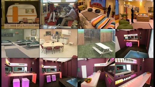 'E4/Banksy' theme, designed by Patrick Watson. Elstree compound. Secret room(s): There were some staris that lead to an upstairs room John used for a task. Notes: The space used for the Half Way House, Australian room and various tasks for BB8 returned for a few more tasks in Celebrity Hijack. The pool from BB8 was replaced with a hot tub. The bedroom was completely different from the one in BB8. It also had access to a gym. The bath tub was moved to its appropriate place in the bathroom whilst the fridge and oven were moved in to the kitchen. The diary room chair from BB8 returned but was lit with purple lighting whilst there were purple paint splodges round the living room. Big Brother 9 (2008)/Celebrity Big Brother 6 (2009) 'Shattered' theme, designed by Patrick Watson. Elstree compound. Notes: This was the first house to have an offical task room. This house was divided via a heaven/hell divide similar to BB3's rich/poor twist. The bathroom, luxury bedroom and most of the garden (including pool) belonged to the heaven side, whereas the kitchen, B Block bedroom and jail end of the garden were on the hell side. For CBB6 2 more bedrooms were installed. One for LaToya Jackson coming from the B Block bedroom, and one for the Head of House by the luxury bedroom. The blue bathroom was repainted purple for CBB6. The BB9 garden was painted blues and yellows for CBB6 whilst the pool was replaced with carousel horses, the jail was made larger, and the nomination pod used in BB9 was replaced with a heated seating area. The overall series theme of CBB6 was 'celebrity' so the CBB6 house added a few stars to the carpets and wall pannels. Big Brother 10 (2009) 'Basic' theme, designed by Patrick Watson. Elstree compound. Notes: This house was sh!t. But I'll let you decide. For the first time every area in the house was contained within its own respective room e.g. the kitchen was in its own room, the dining room was in its very own room and the living area was in its own room. Supposedly several features and rooms were symbolic or representative of previous BB series which would fit in with the BB10 thumb print/identity logo. Perhaps the fact it shares an almost identical layout to BB9's house is actually a stroke of genius by mimicking what BB2 was to BB1? Or perhaps it was just credit crunched and/or lazy. You decide.