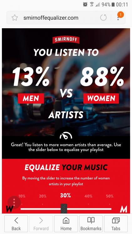 12% Women When I try the Equalise Your Music slider it just generates a playlist which adds the likes of Ariana, Gaga, Pink, Camila etc. (ie. the most popular female artists) to what I've listened to before rather than tailoured selections - not a particularly clever algorithm really. |