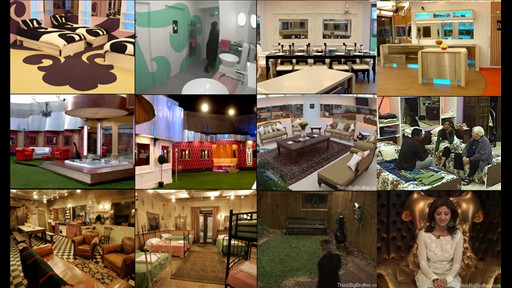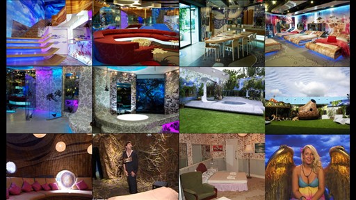 'E4/Banksy' theme, designed by Patrick Watson. Elstree compound. Secret room(s): There were some staris that lead to an upstairs room John used for a task. Notes: The space used for the Half Way House, Australian room and various tasks for BB8 returned for a few more tasks in Celebrity Hijack. The pool from BB8 was replaced with a hot tub. The bedroom was completely different from the one in BB8. It also had access to a gym. The bath tub was moved to its appropriate place in the bathroom whilst the fridge and oven were moved in to the kitchen. The diary room chair from BB8 returned but was lit with purple lighting whilst there were purple paint splodges round the living room. Big Brother 9 (2008)/Celebrity Big Brother 6 (2009) 'Shattered' theme, designed by Patrick Watson. Elstree compound. Notes: This was the first house to have an offical task room. This house was divided via a heaven/hell divide similar to BB3's rich/poor twist. The bathroom, luxury bedroom and most of the garden (including pool) belonged to the heaven side, whereas the kitchen, B Block bedroom and jail end of the garden were on the hell side. For CBB6 2 more bedrooms were installed. One for LaToya Jackson coming from the B Block bedroom, and one for the Head of House by the luxury bedroom. The blue bathroom was repainted purple for CBB6. The BB9 garden was painted blues and yellows for CBB6 whilst the pool was replaced with carousel horses, the jail was made larger, and the nomination pod used in BB9 was replaced with a heated seating area. The overall series theme of CBB6 was 'celebrity' so the CBB6 house added a few stars to the carpets and wall pannels. Big Brother 10 (2009) 'Basic' theme, designed by Patrick Watson. Elstree compound. Notes: This house was sh!t. But I'll let you decide. For the first time every area in the house was contained within its own respective room e.g. the kitchen was in its own room, the dining room was in its very own room and the living area was in its own room. Supposedly several features and rooms were symbolic or representative of previous BB series which would fit in with the BB10 thumb print/identity logo. Perhaps the fact it shares an almost identical layout to BB9's house is actually a stroke of genius by mimicking what BB2 was to BB1? Or perhaps it was just credit crunched and/or lazy. You decide.