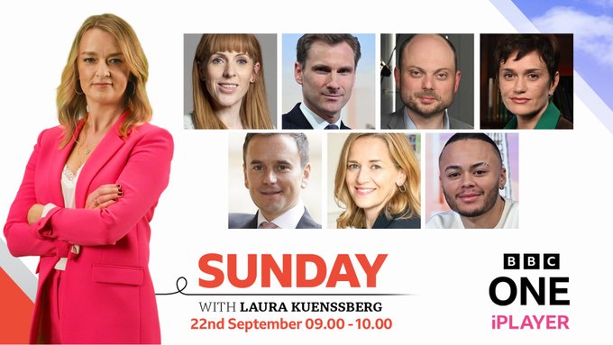 Conservative leadership contender James Cleverly Lib Dem leader Ed Davey Actors Ben Whishaw and Lucian Msamati Her Panel: Broadcaster Piers Morgan Journalist Ava-Santina Evans General John McColl https://x.com/BBCPolitics/status/1834987974951399478 |