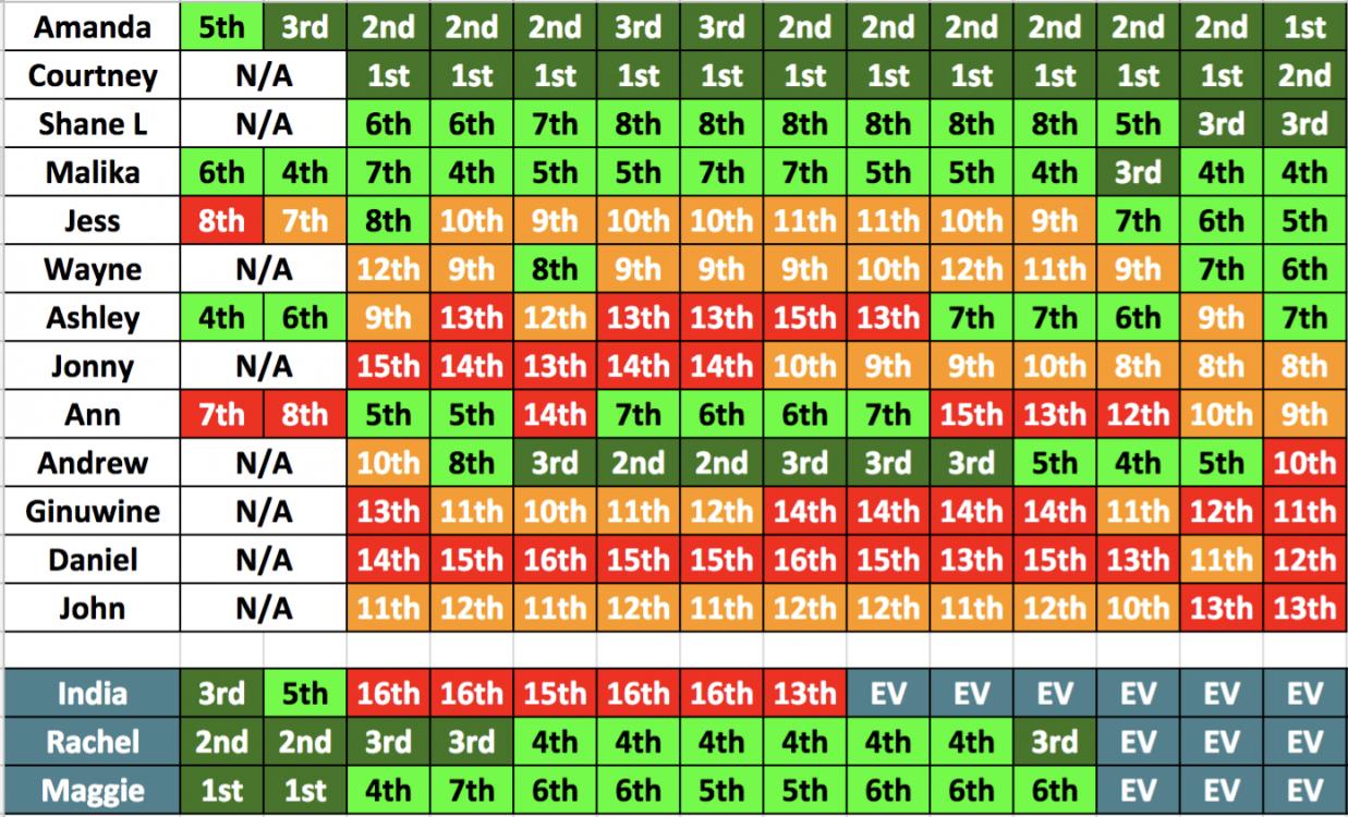 2. Jess (-) 3. Ashley (+2) 4. Courtney/Shane J. (+6) 5. Shane L. (+4) 6. Amanda (-2) 7. Wayne (-) 8. Ginuwine (+3) 9. John (-3) 10. Andrew (+3) 11. Jonny (-1) 12. Daniel (+3) 13. Ann (+1)