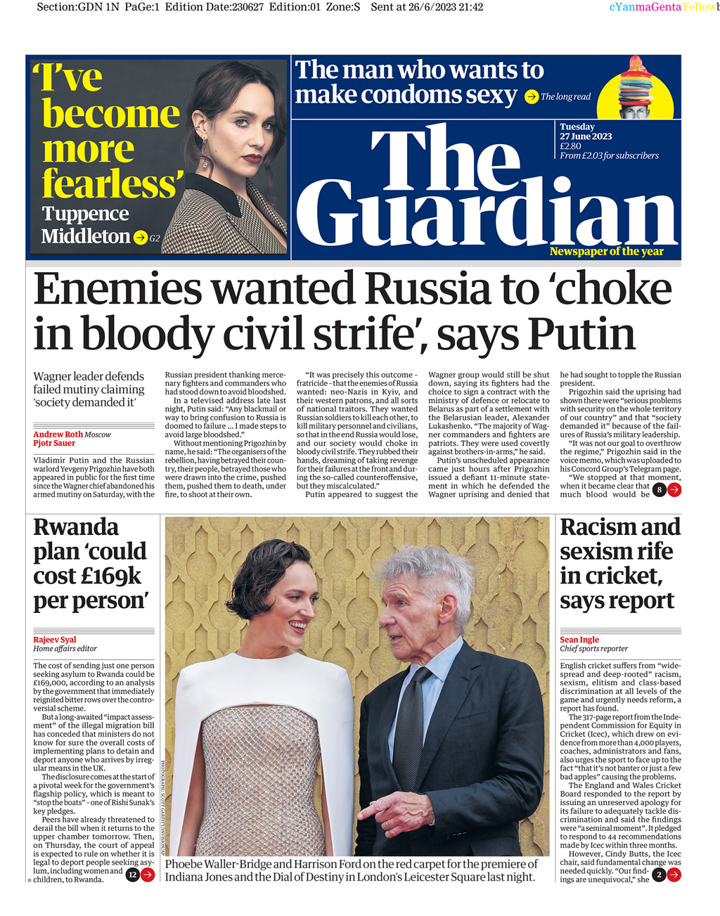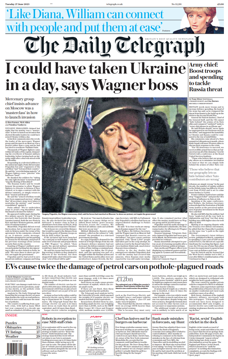 [Wagner group boss Yevgeny Prigozhin has shared an audio statement directly addressing the mutiny in Russia over the weekend. In the 11-minute clip, he said: "We started our march because of an injustice." He claimed the decision to turn around the march on Moscow was because he and his fighters didn't want to shed Russian blood. The former Wagner leader also said it was not his aim to overthrow the Russian government. "We stopped at the moment when the first assault unit, which had approached 200km to Moscow, deployed its artillery, made a reconnaissance of the area," he said. "It was obvious that a lot of blood would be spilled at this point. So we felt that the demonstration of what we were going to do was enough. "And our decision to turn back was influenced by two most important factors. The first factor was that we did not want to shed Russian blood. "The second factor was that we were going for a demonstration of our protest, not to overthrow the government in the country." The Wagner leader also repeated his claim that his troops were attacked by Russian soldiers, saying 30 people died with more injured. Prigozhin added that Belarusian President Alexander Lukashenko "extended his hand and offered to find solutions for the further operation of Wagner in a legitimate jurisdiction". But he did not offer any details about where he was or what his future plans are.] https://news.sky.com/story/russia-uk...dates-12541713 |