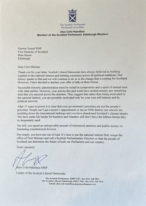 Is a new leader going to help however. Plus if he resigns, would the no confidence motion in the SNP government still go ahead? Because one no confidence motion was as to him. The other though, was as to the whole SNP as the government. |