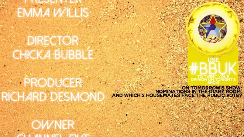 the end credits scroll will have a sand background to show the summer feel. the middle section of the eye logo will appear in the corner with a little box moving down that will A. have the text 'Use #BBUK to tweet your opinions on tonight's show' and B. Marcus will narrate the top events that will happen on the next nights show. [ PS: the names in the credits are random haha ]