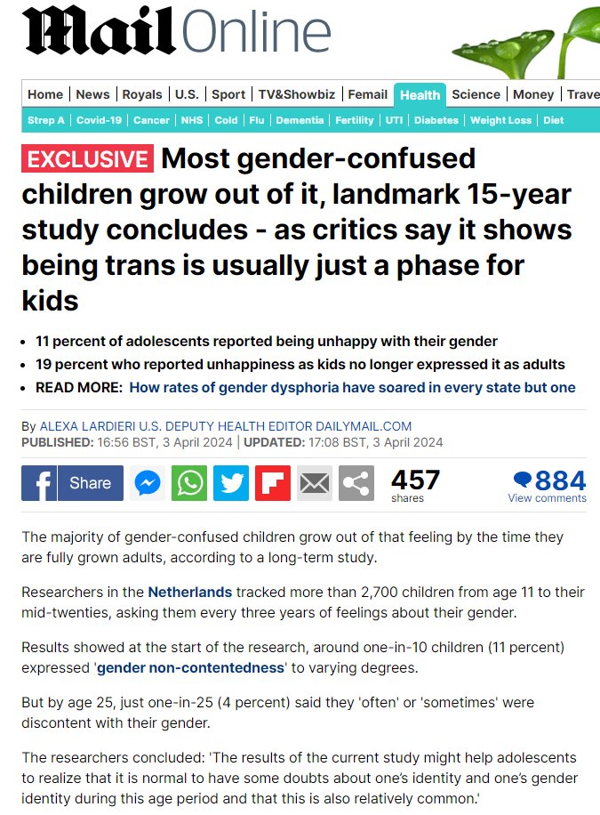 or "gender-questioning" children grow out of it, according to a 15-year longitudinal study conducted in the Netherlands,] Yes Nicky this is so wrong in your nation. |