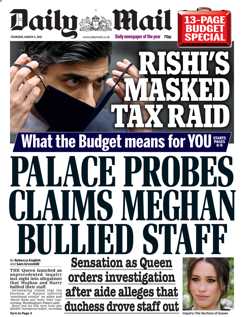 Harry and Meghan, whose 'no holds barred' CBS interview with Miss Winfrey will be broadcast on Sunday in America and in the UK on Monday at 9pm on ITV – which reportedly paid £1million – hit back at the allegations in The Times. A spokesman claimed the newspaper was being 'used by Buckingham Palace to peddle a wholly false narrative' before the interview.