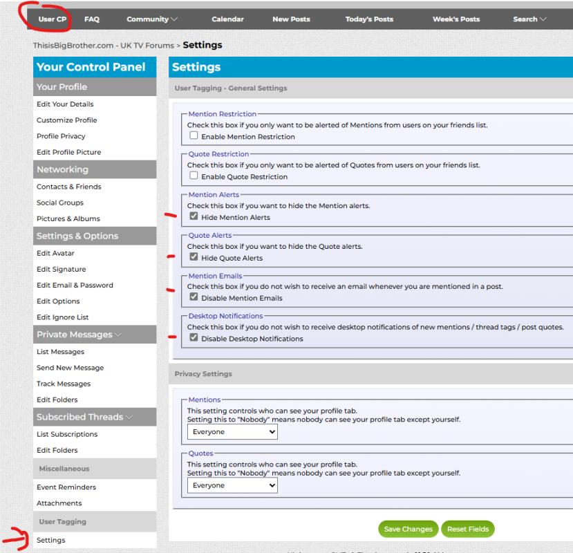 On Desktop browser - Go to User CP (top-left of screen) - Settings under User Tagging (at the bottom-left). Then you can select 'Hide Mention Alerts' and 'Hide Quote Alerts' to turn of the PM-style notifications on the forum. You can also 'Disable Mention Emails' and 'Disable Desktop Notifications'. On Mobile browser - Go to Site Navigation (with the 3 horizontal bars), then User CP, then scroll down to the bottom and press Settings under User Tagging. And select the same options above. Last edited by James; 02-06-2024 at 12:19 AM. |