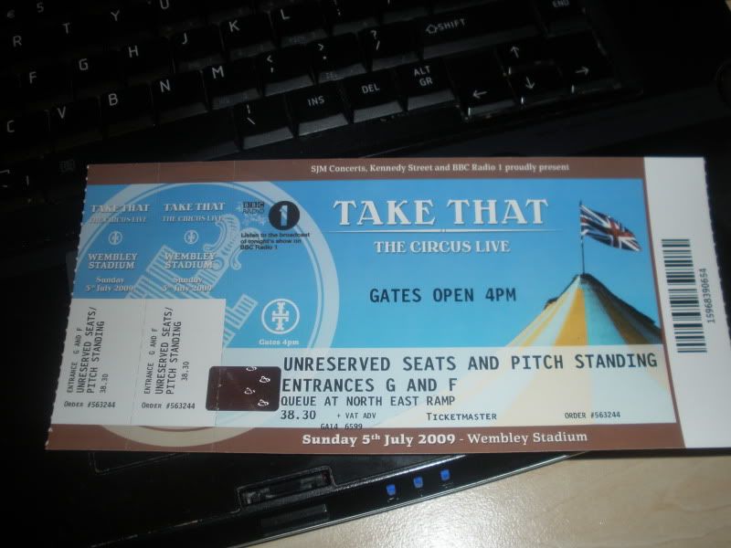 26th June Up at 4am, flight was at 6.30am, arrived at our hotel about 8.30ish I think. After thankfully having a room free, we checked in where they asked if we were going to the tour and gave us a 5 page leaflet about it! It was amazing; it seemed nearly everyone staying there was going! Amazeeeee. Then we went in search of breakfast. Best I could find was veggie sushi in Tesco Express down the road! So after that and attempting to fall asleep in front of the telly me and my mum went to sleep for a while, me for a good 3 hours! By then it was 2 and we went down to the hotel restaurant where they had a special Take That menu where all the dishes were named after Take That songs! I ordered ‘All I Want Is You’ which was some cheese thing for starter. For main I got ‘The Garden’ pizza which was a margarita with salad and they had cut out the edges to make it into a symbol! AMAZING! It was like the hotel was Take That mad. For dessert I got ‘Meaning of Love’ which was lemon torte-yum. We started walking to the stadium at about 4 and soon bumped into loads and loads of Thatters, along the way there were lil mini TT cards on the road! Once we were about 3 minutes away from the stadium there was a Thatter eruption-TT tops, symbols, hats, screams, people selling stuff-absolutely everywhere. We picked up the tickets from the box office and then it was merchandise time! I had to go to 3 different stalls as they didn’t have want I wanted in all of them-throughout the 3 I got 6 t-shirts,hoody,umbrella,2 posters,2 necklaces,braclet,red nose a hat and a keyring( I got another t-shirt and picture cards the next day). As I had promised my mum seats in Manc we went to the GA seats which were WAYYYYYY at the back, we got 3rd row middle in the middle somewhere. Before Gay Go, there was the usual music playing, singsongs and people watching. There was also a TT blimp, birds and balloons going across/up and down on the screens Being at the back for this concert made me notice the people going to a Take That concert. I say about 50% were women from 20ish to late 30ish but there were kids from 3(boys and girls) right up to 70 year old women! There was families, couples, friends, all sorts. Gary Go came on about 6 and he was alright, he dedicated his song ‘Wonderful’ to Michael Jackson, saying he had been a huge influence for him and anyone in music who said he was lying. James Morrison came on about half an hour later, best song was definitely Broken Strings. He was very good live. He dedicated his last song to Michael Jackson, although I can’t remember what song it was. The guys came on about 8.30; there was the balloons and all the other stuff going on. The balloons went off into the sky and the guys appeared singing Greatest Day! Then they all introduced themselves, Mark getting the loudest cheers and broke into Hello and then they went down the steps of the B-Stage and starting shaking the crowd’s hands!!!! Sooo going to the B-Stage one of my London dates. For Could it be Magic there was mad dancing all around-the boys and us! Although Jay was mad dancing all night! Pray was proper dancing, with all the guys hugging in the middle during the song-so cute! A Million Love Songs had lots of swaying and singing, Mark ‘conducted’ the crowd. Back for Good has the rain with Gary saying ‘Bring on the rain’ and them laughing at the wet audience-the meanies! Amazingly BFG is no longer the loudest song at a TT concert although it was still very loud! The boys shove the microphones towards the crowd a lot during BFG. Next came the elephant, the boys looked so happy when everyone wooped. I spotted Briony hanging off the back as the tail; she was tossing her head about like a mad woman! When the reached the stage Mark said ‘Are you ready to run away to the Circus?’ Shine began immediately with all sorts of Circus acts going on on stage and the ringmaster also saying ‘It’s what you’ve been waiting for! Welcome to the Circus!’ Mark strutted out in this white outfit and big top hat-no spilt trousers this time Loads of very long ‘Shineeeeeeeeeeeeeee’ notes coming from the crowd though. Up All Night again felt like a ginourmous party, with Jay going afterwards ‘I could see some Up All Night’ dancing going on out there!’ Next it was Jay’s turn to mention Michael Jackson, saying it was hard to do a concert after such a sad thing happening. Jay said the moonwalk was the first ever dance move he learned with Howard saying Gaz was still trying to learn, lol! It was touching. Jay then his little bit with Wooden Boat and How Did It Come to This. The crowd completely pissed me off during WB as loads went to the toilet. For HDICTT, Jay got us clapping our hands and thanked us. He said they said thanks a lot but there was nothing like saying it front of a live audience-loud wooping ensued. The boys then left the stage and Gary and his piano and the tightrope walker took the spotlight. Gary’s vocals on The Circus are unbelievable! They sound better than on the album, although personally I think the boys sound better live than recorded anyway. What Is Love was next and it was finally Howard’s chance to shine-it still amazes me they can put on make-up and sing at the same time! The 90’s medley was next-thrusting, dancing, with Gary’s moonwalk getting a huge cheer. The unicycles appeared and when How was getting on he moved his emm equipment to get on and the camera zoomed in! I swear half the place was nearly fainting! Jay was next, him and Howard are amazing on the unicycles, going all the way down the runway and around the B-Stage. Mark had to be helped up again-a gag to his shortness and he fell off at the B-Stage although that’s intentional: P Gary then appeared on his trike and send the whole place off-still so funny! Then they did some more dancing and all DROPPED THEIR PANTS!!!! They revealed TT boxer shorts-place went MENTAL! I couldn’t get a pic though as smoke cam