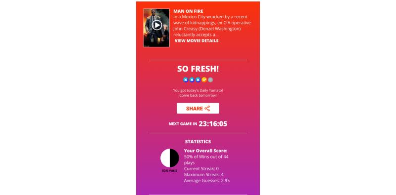 66% WINS Your Overall Score: 66% of Wins out of 47 plays Current Streak: 0 Maximum Streak: 10 Average Guesses: 2.39 |