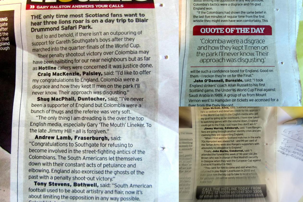 ![]() So in the main tabloid in Scotland, The Daily Record, which most Central belt punters read they have a phone in section where football fans express their views on the latest topics below is yesterdays views about the world cup and you can see that in general they are backing England ![]() Spoiler: |