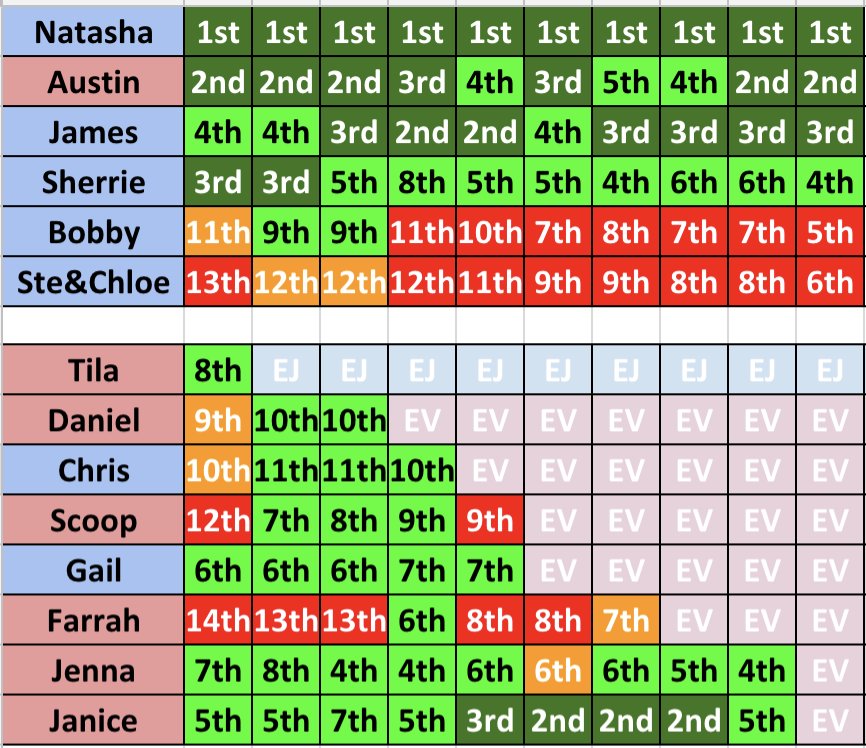 1. Michelle (-) 2. Nadia (-) 3. Daniel (+5) 4. Ahmed (+1) 5. Vanessa (-1) 6. Victor (+1) 7. Shell (-1) 8. Stuart (+1) 9. Marco (+1) 10. Jason (+1) |