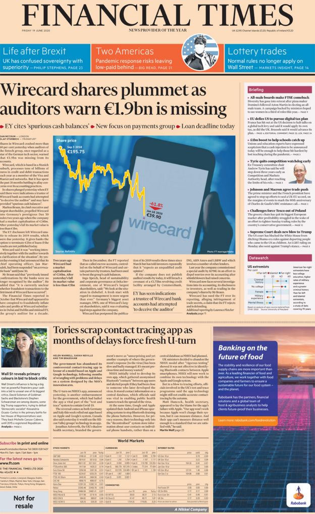 ![]() BBC text [And a graphic on the front of the Financial Times shows the plummeting shares of German payments company Wirecard, after its auditor warned that €1.9bn (£1.7bn) was "missing from its accounts". The paper says the fintech group - once seen as "the star of the German tech sector" - has spent the past year and a half "battling to allay concerns over its accounting practices".] |