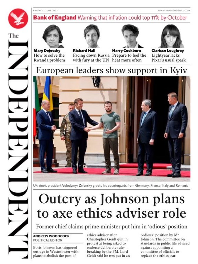 [A pledge from France, Germany, Italy and Romania to back Ukraine for European Union candidate status, a precursor to joining the EU. The paper quotes French President Emmanuel Macron on the four leaders' visit to Kyiv saying: "Europe is at your side and will stay there for as long as it take."]