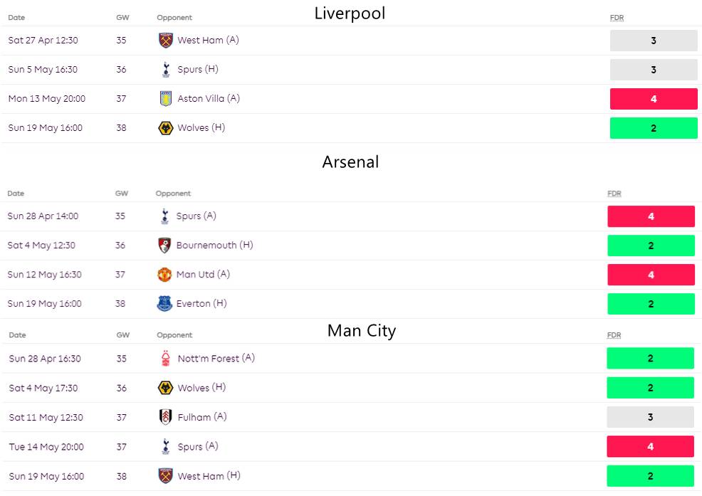 Game difficulty ratings for Liverpool, Arsenal and Man City's remaining games according to Fantasy Premier League.