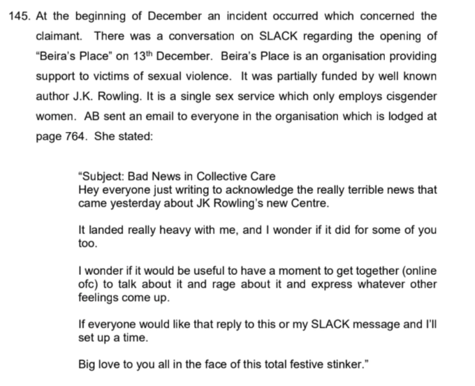 Judge (p94): “Once again, we make the point that AB worked in a Rape Crisis Centre. It is absolutely clear that they knew that changing their name to a name which sounded male was going to cause difficulties.” |