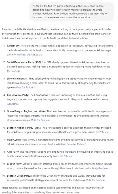 Hi Chat GPT rate the UK political parties from good to bad who would Lock us down again at the drop of a hat for a cold or memo from the corrupt WHO..