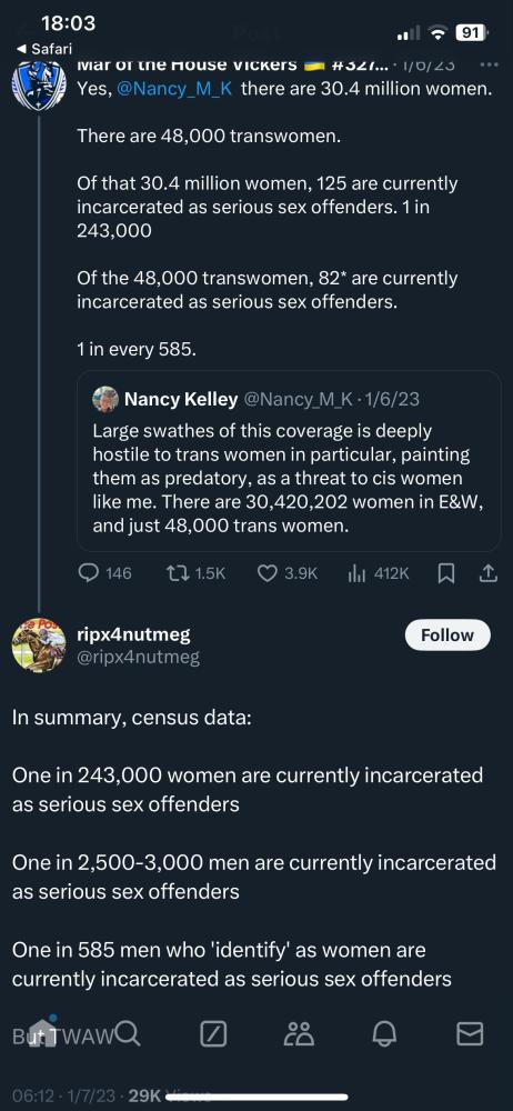 Women apparently is one in 243,000 compared to Transwomen being one in 585 for committing sex offenses, according to one of Ninastar's sources.