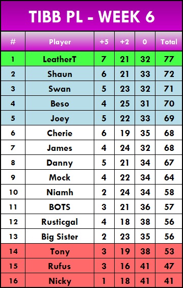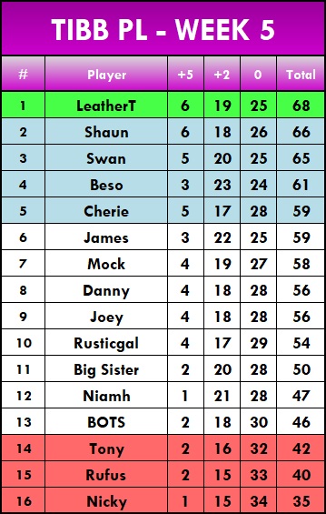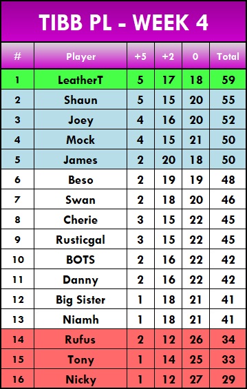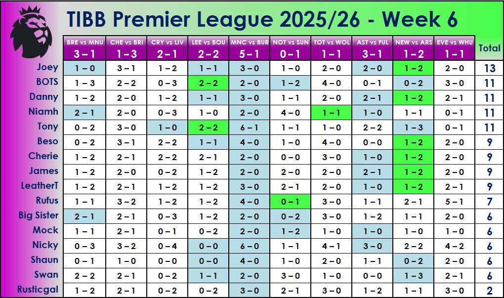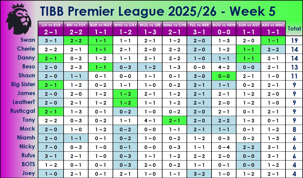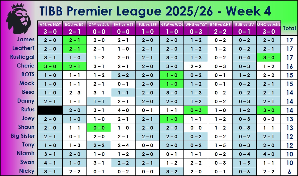 Bournemouth 1-0 Fulham Saturday 4th October Leeds 1-2 Tottenham Arsenal 2-0 West Ham Man Utd 1-1 Sunderland Chelsea 0-1 Liverpool Sunday 5th October Aston Villa 2-1 Burnley Everton 0-0 Crystal Palace Newcastle 2-1 Nottingham Forest Wolves 0-1 Brighton Brentford 0-3 Man City Good luck everyone.