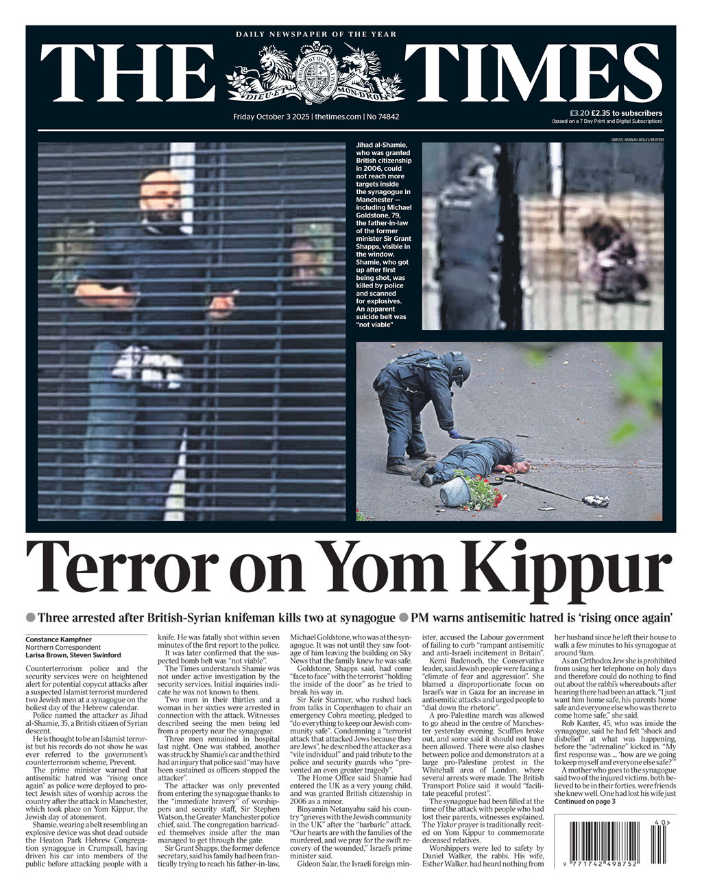 ![]() [Pro-Palestinian march in Manchester centre on the day a knifeman killed two people at a synagogue in the city] |