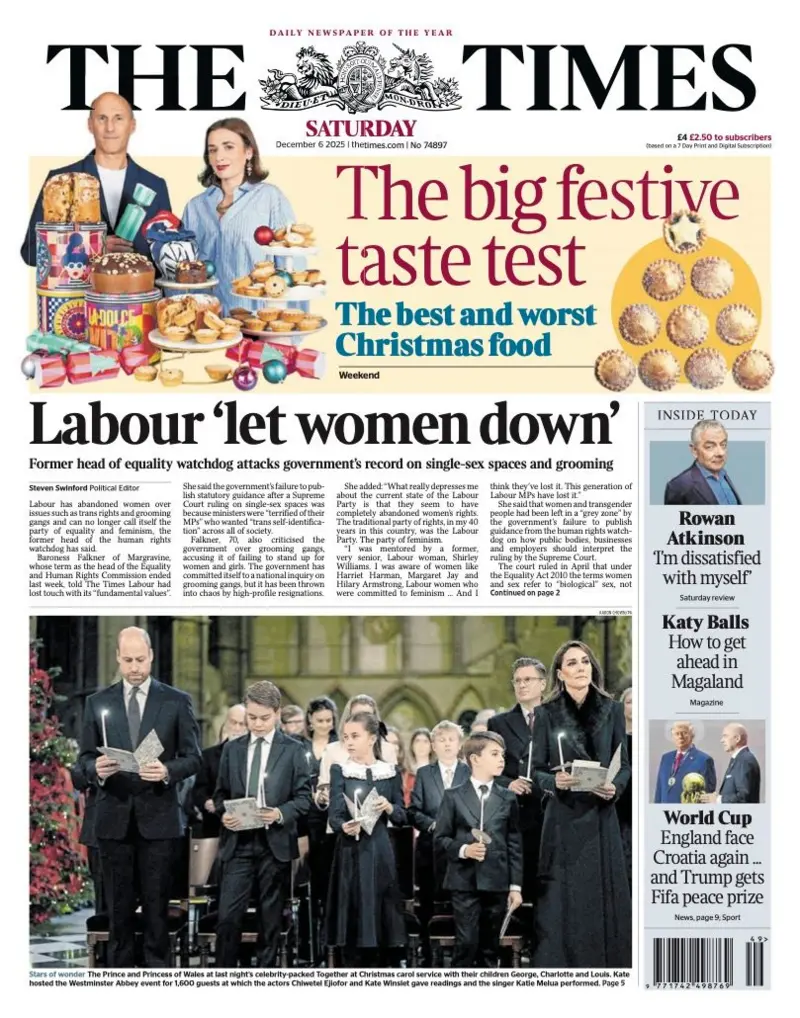 ["Labour 'let women down'". It quotes the former head of the Equality and Human Rights Commission, Baroness Falkner, as saying the "failure" to publish guidance following a Supreme Court ruling on single-sex spaces reflected a government that has left women and transgender people in a "grey zone".]